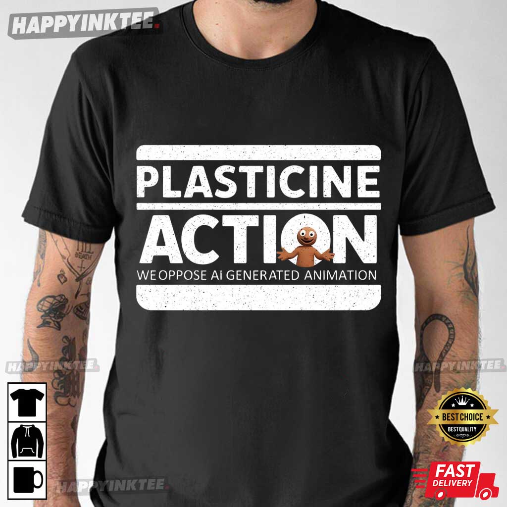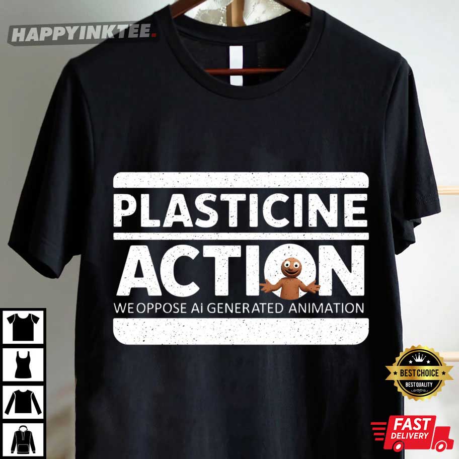 The design has the slogan “Plasticine Action – We Oppose AI Generated Animation.” If you love stop-motion, traditional art, or just care about keeping animation real, this Anti-AI art shirt is a great way to show what you think.