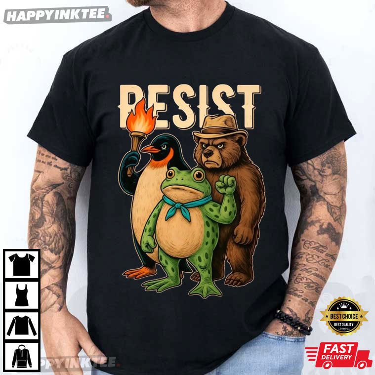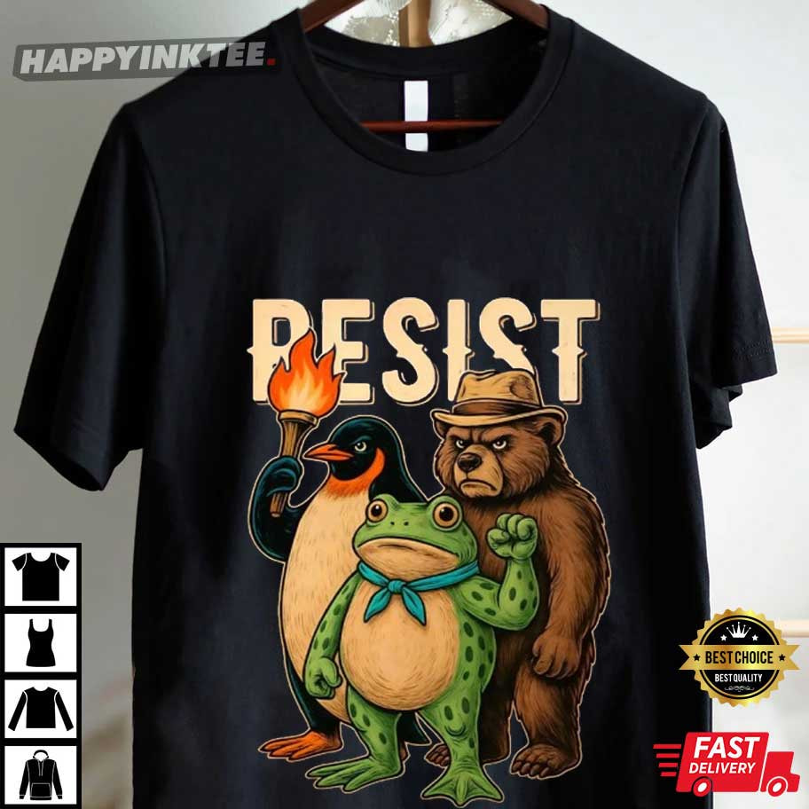 The design features three unlikely heroes — a determined frog with a blue bandana, a grumpy bear in a fedora, and a penguin holding a flaming torch — standing side by side beneath the powerful slogan “RESIST.” Their old-school cartoon style and muted color palette give the shirt a nostalgic feel, while the message stays loud, proud, and timeless.