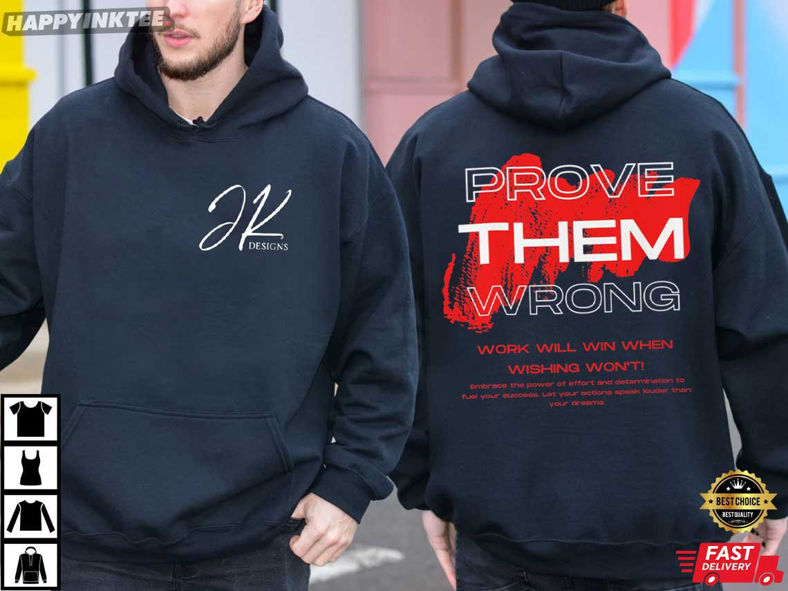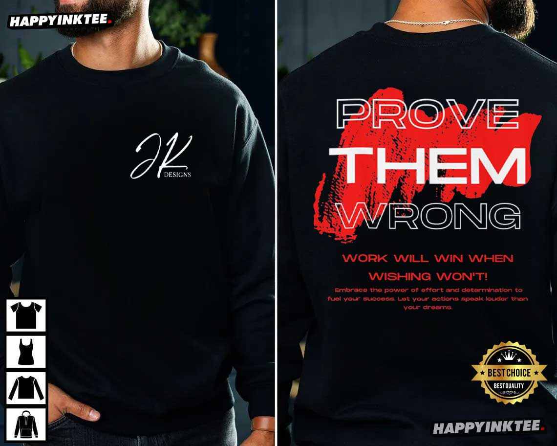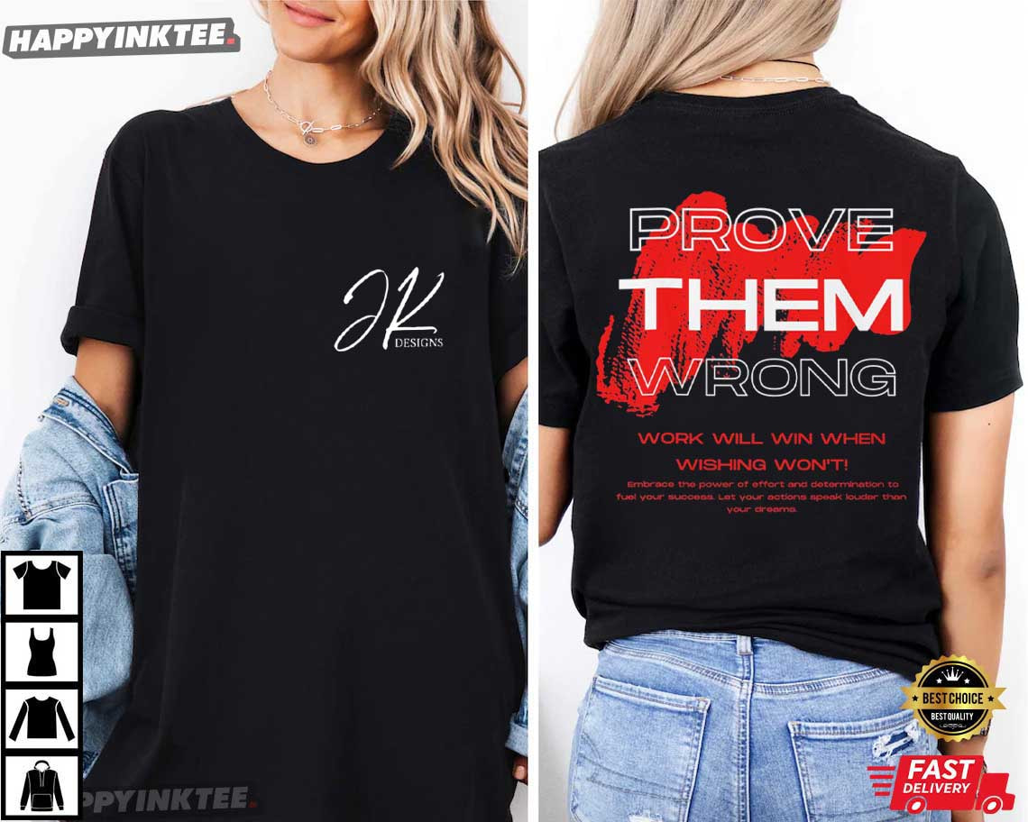 No shortcuts. No excuses. Just results. The Prove Them Wrong Work Will Win When Wishing Won’t Motivational T-Shirt is built for those who move in silence and let their grind make the noise. With a clean front logo and a bold back statement, this design blends modern streetwear with relentless ambition. Modern motivational apparel has evolved beyond basic gym quotes. Customers of today seek statement back prints, strong contrast graphics, and bold typography that complement hustle culture and personal growth.