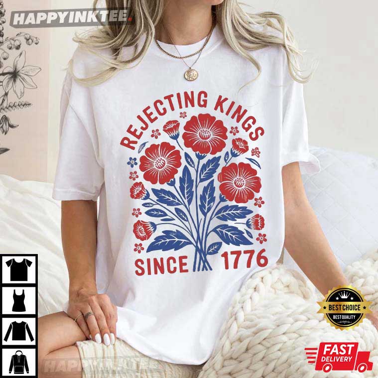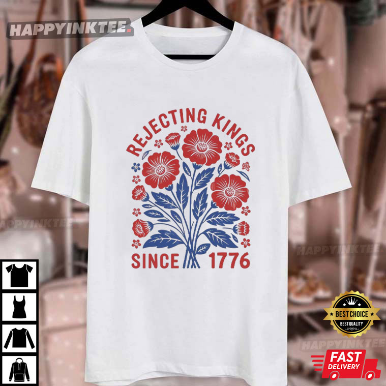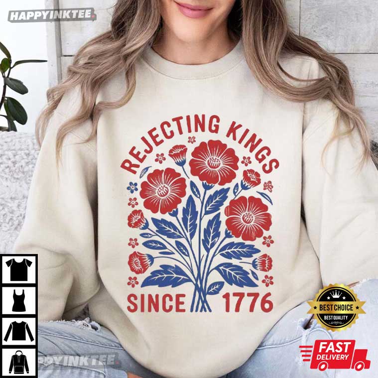 Patriotic vibes mix with some cool folk-art flair in the Rejecting Kings Since 1776 Flower Pro Democracy T-Shirt, a cool design that mixes independence and artistic vibes in a classic style.