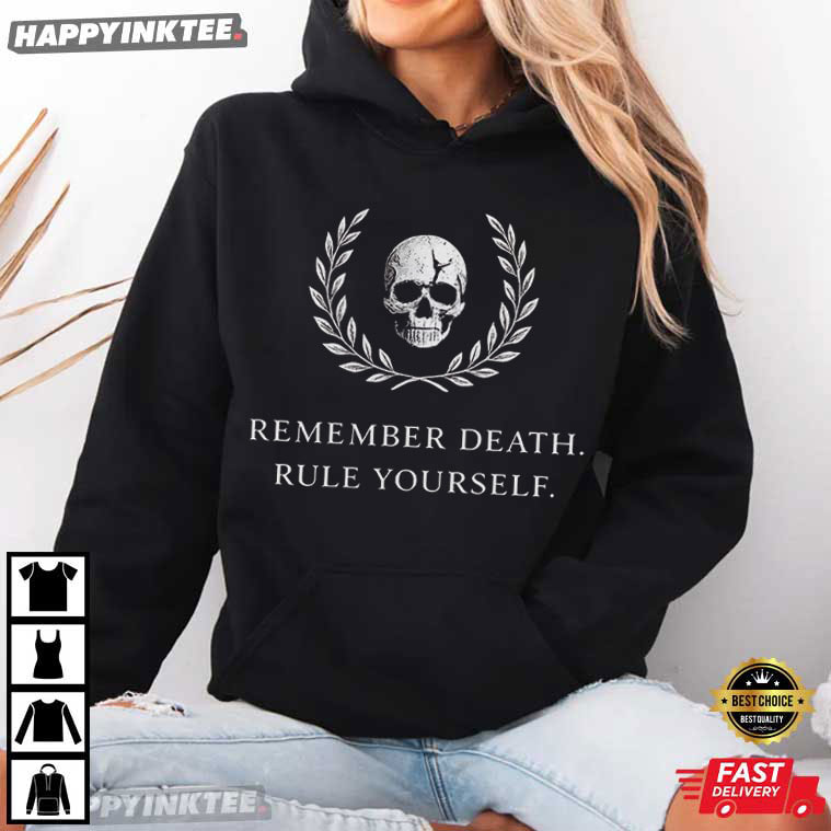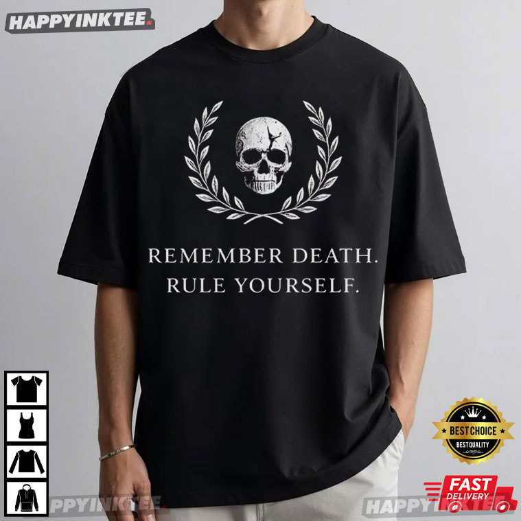 Minimal, striking, and deeply philosophical, the Remember Death Rule Yourself Skull Laurel Memento Mori T-Shirt is intended for people who value the significance of their fashion choices. Rooted in ancient Stoic philosophy, this piece blends timeless symbolism with a clean, modern aesthetic. Inspired by the concept of memento mori—a Latin phrase meaning “remember that you must die”—this design encourages reflection, discipline, and intentional living. In fact, it’s inspiring rather than depressing —a lesson to take charge of your life and concentrate on what really matters.