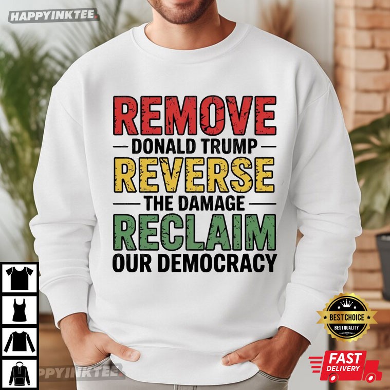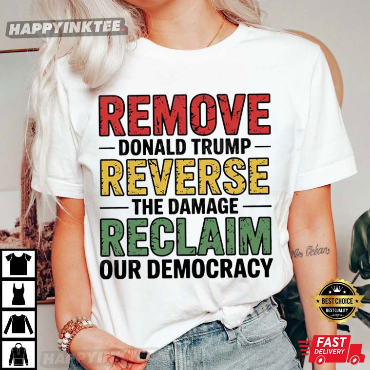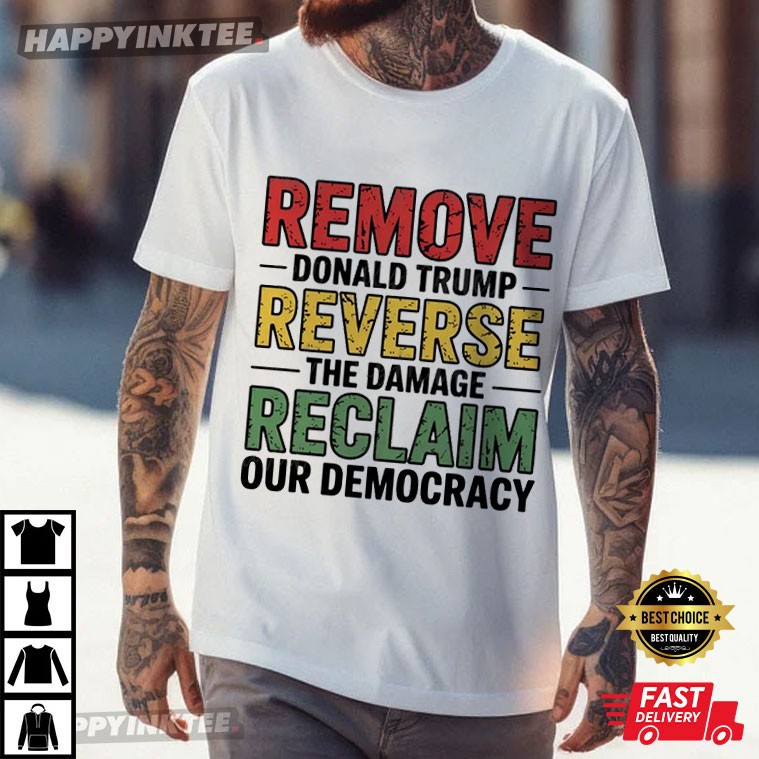 Make a powerful statement with the Remove Donald Trump Reverse The Damage Reclaim Our Democracy Anti Fascist T-Shirt. This shirt boldly expresses your opposition to Trump’s leadership and supports the fight to reclaim democracy, with a strong anti-fascist message.