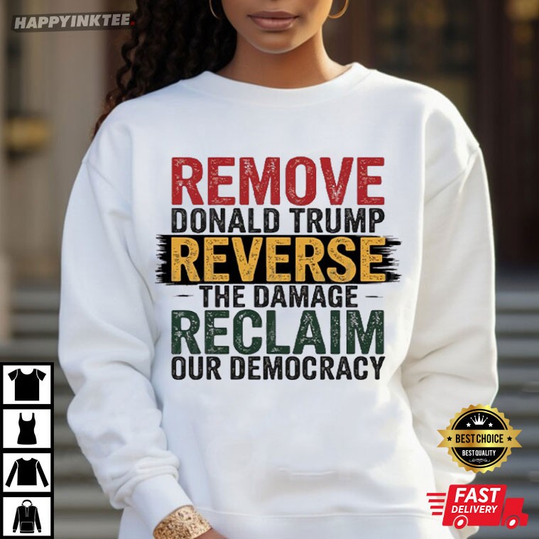Defend democracy and fight fascism by wearing the Remove Trump Reverse The Damage Reclaim Our Democracy Anti Fascism T-Shirt. This bold shirt sends a powerful message against Trump’s policies while standing firmly against fascism, promoting the restoration of democratic values. Stand up for democracy, reverse the damage, and fight against fascism with the Anti-Trump T-shirt.
