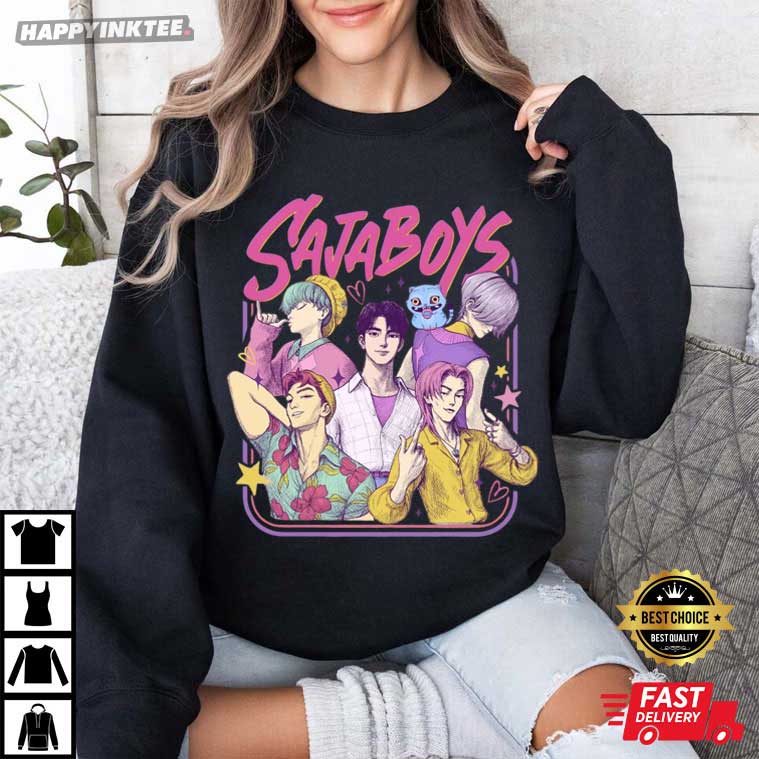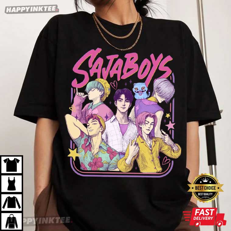 Get pumped to slay the K-pop scene with our Saja Boys T-Shirt! This Kpop Demon Hunters shirt shows the Saja Boys boy band as retro-styled Demon, mixing their usual charm with a cool, supernatural vibe. It’s a must-have for fans and vintage clothing lovers! If you’re looking to rock that ’80s K-pop vibe with a little flair, this tee is just for you!