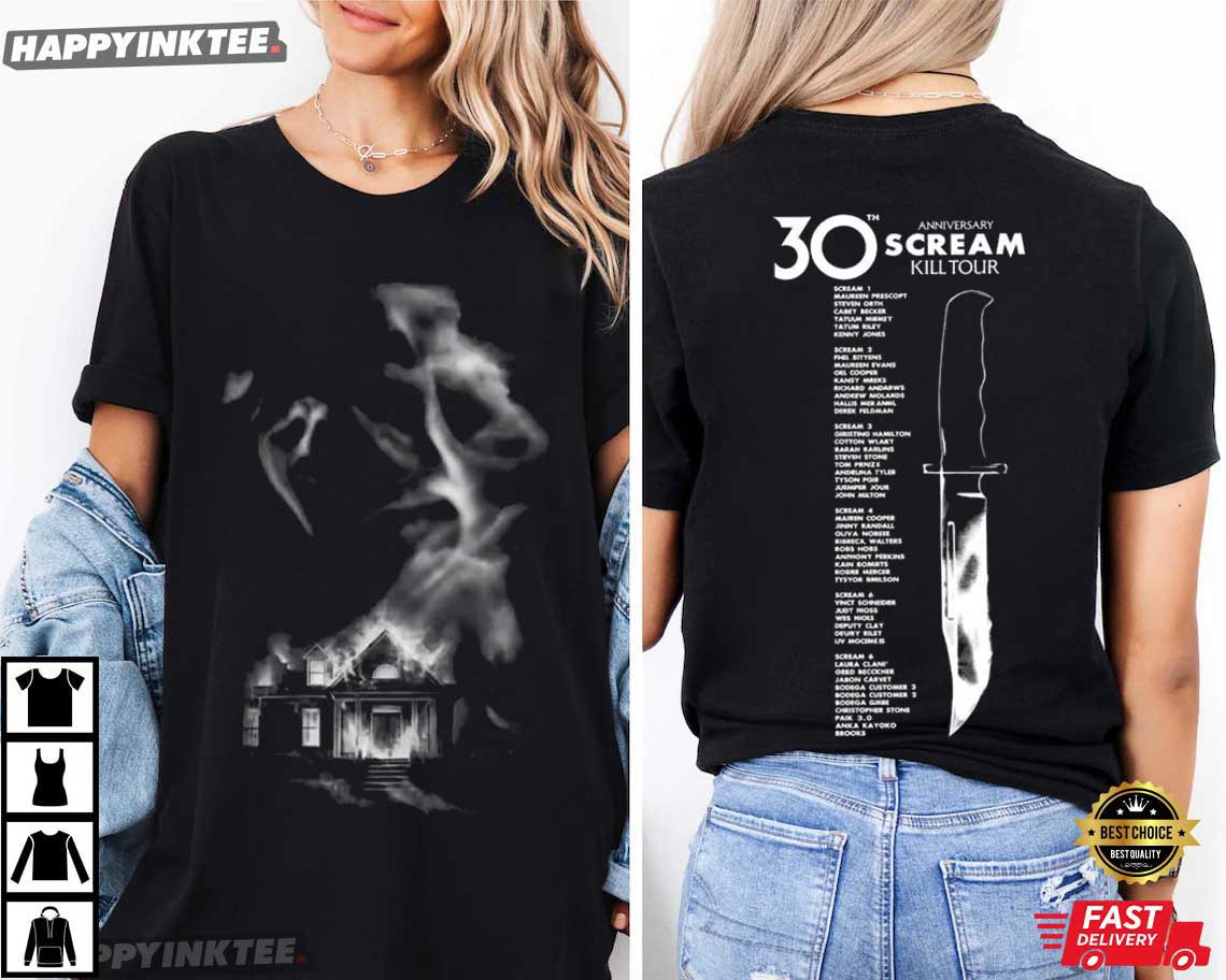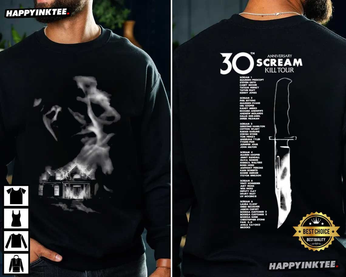 The Scream Kill Tour 30th Anniversary Ghostface Horror Movie T-Shirt is a chilling tribute to one of the most iconic slasher franchises in horror movie history — Inspired by the legendary Ghostface killer and the unforgettable moments from the Scream film series, the 30th anniversary of the ground-breaking horror classic that revolutionized the genre is commemorated by this graphic tee. With its dark artwork and tribute-style design, it’s a perfect way for fans to celebrate three decades of suspense, mystery, and unforgettable slasher moments.