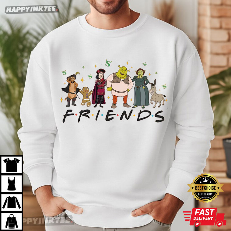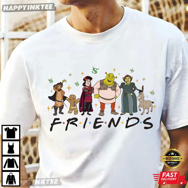 Check out this Shrek Characters T-Shirt that brings together Puss in Boots, Lord Farquaad, Gingy, Shrek, Fiona, and Donkey, all decked out in that classic Friends logo style. It’s a total win for fans of DreamWorks’ classic movie and anyone who loves those nostalgic TV parodies. It’s got humor, pop culture, and fandom all wrapped up in one awesome shirt.
