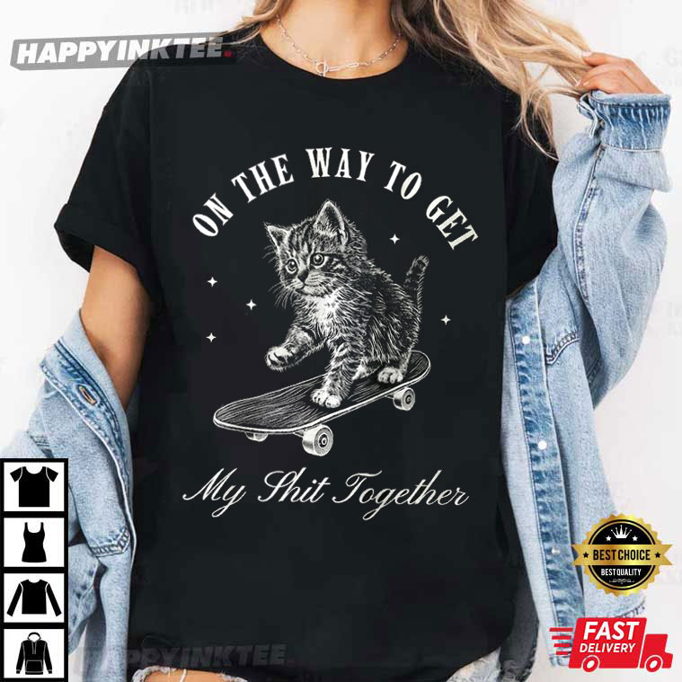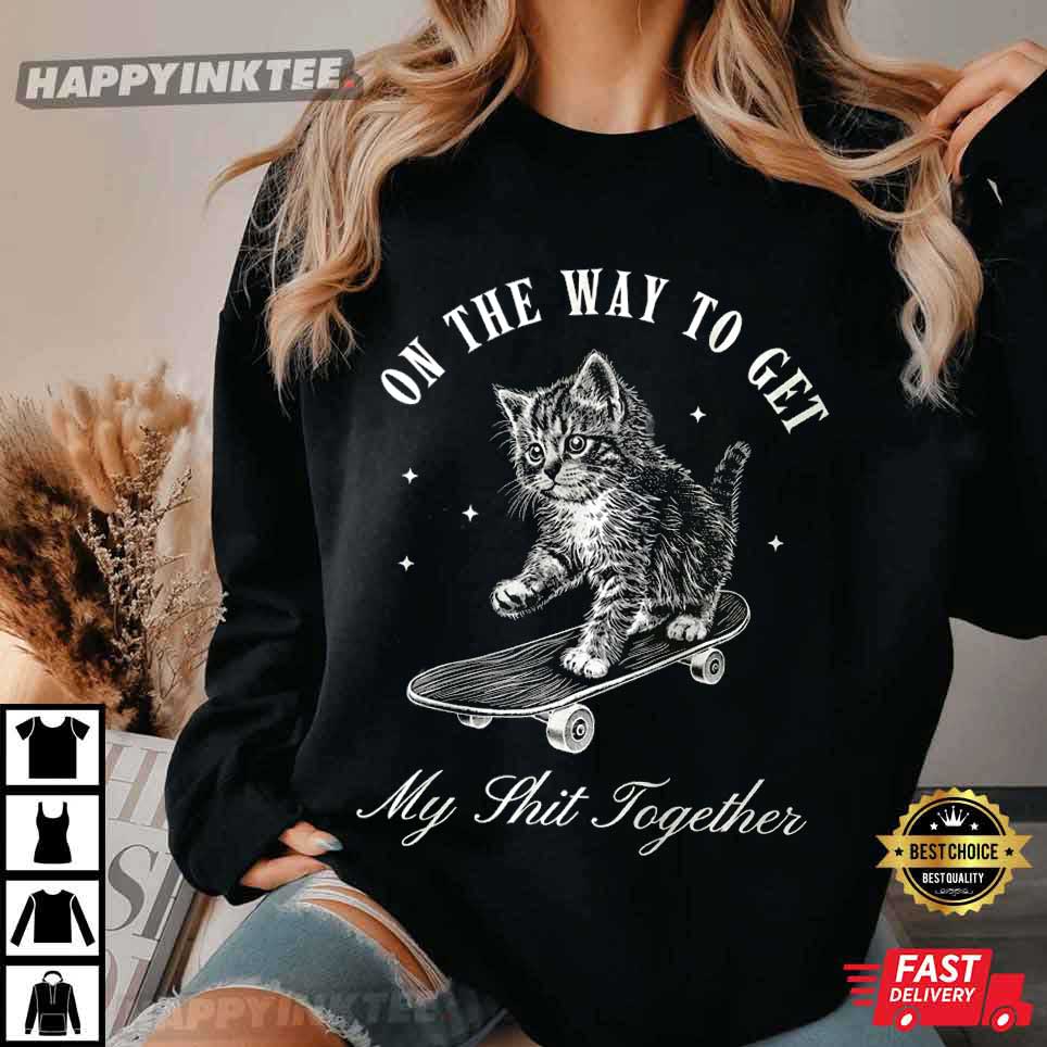 A little kitten is front and center, cruising on a skateboard with a mix of determination and maybe a bit of confusion, all while the phrase reads: “On The Way To Get My Sht Together.”* It’s totally relatable, kinda sarcastic, and unexpectedly uplifting at the same time.