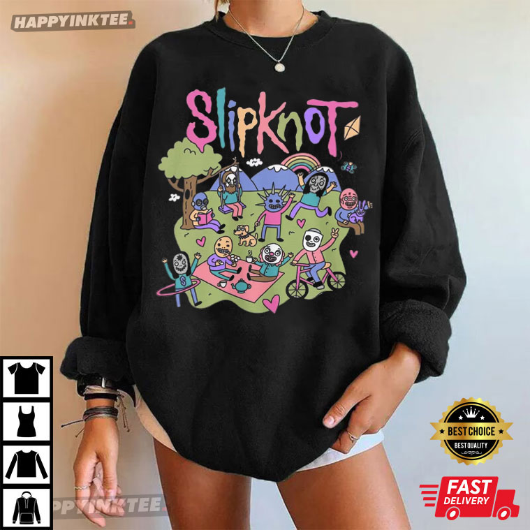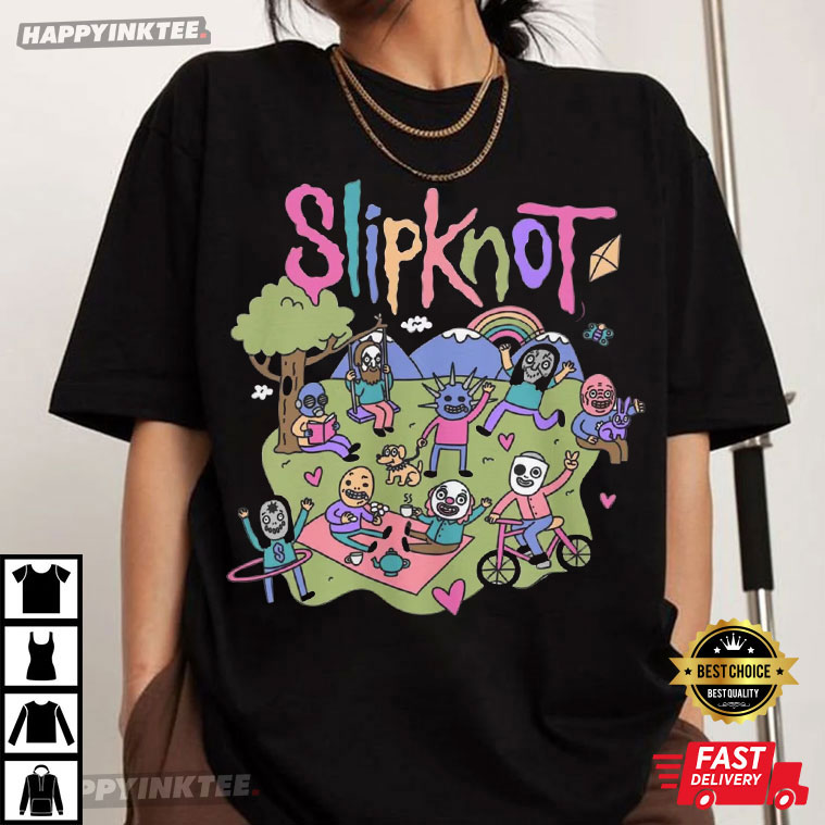 The Slipknot Funny Cartoon Heavy Metal T-Shirt brings the turmoil of heavy metal into a fun universe. It takes the legendary masked band and puts them in a cartoonish, bright, and infantile way. The members are having a great time with rainbows, puppies, kites, and bikes, all while still wearing their renowned masks.