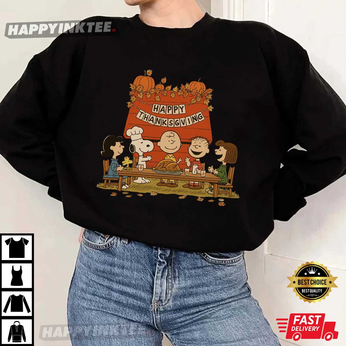 This Snoopy Thanksgiving Peanuts Cute Woodstock T-Shirt brings back memories of Charles Schulz’s classic comic strip. It’s a wearable bit of holiday cheer that will warm your heart like pumpkin pie. It shows Snoopy, Woodstock, Charlie Brown, and the whole gang surrounding their Thanksgiving feast.