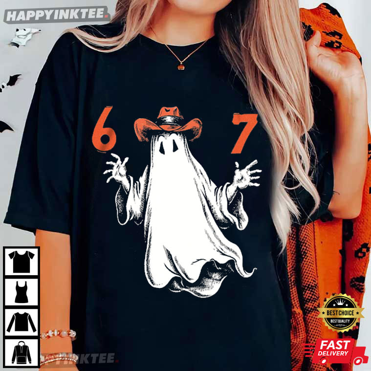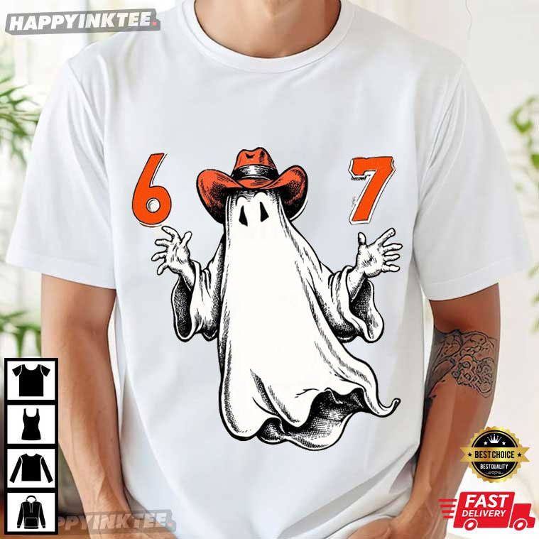 The design showcases a vintage-inspired ghost wearing a cowboy hat, floating proudly between orange “6” and “7” numbers for a bold and eye-catching look. Whether you’re giving out candy, celebrating at a Halloween party, or simply surviving October, this shirt keeps your outfit festive and fun. Ideal for meme enthusiasts, Halloween enthusiasts, or anyone who like a little eerie humor with their fall attire.