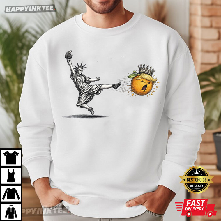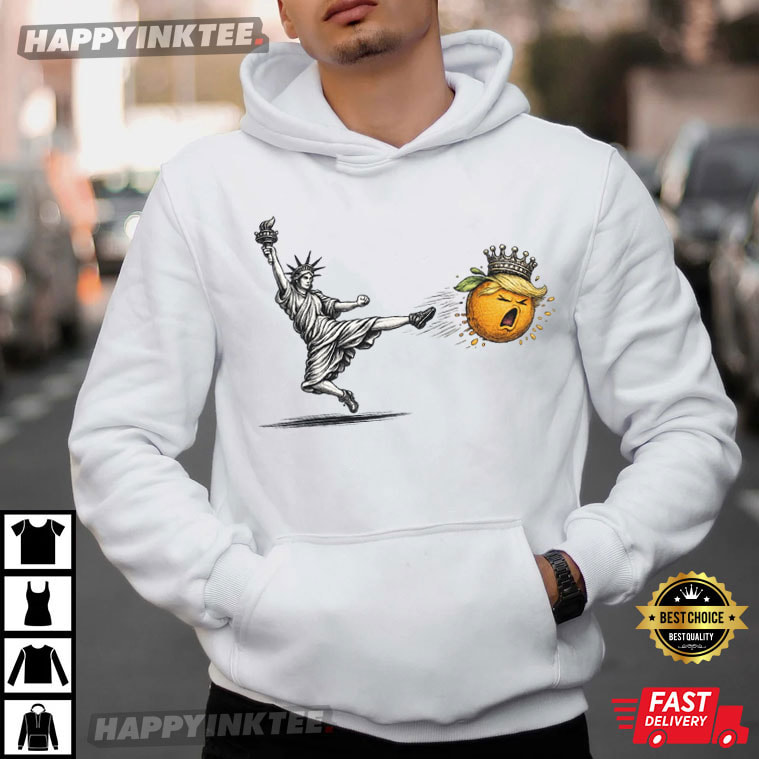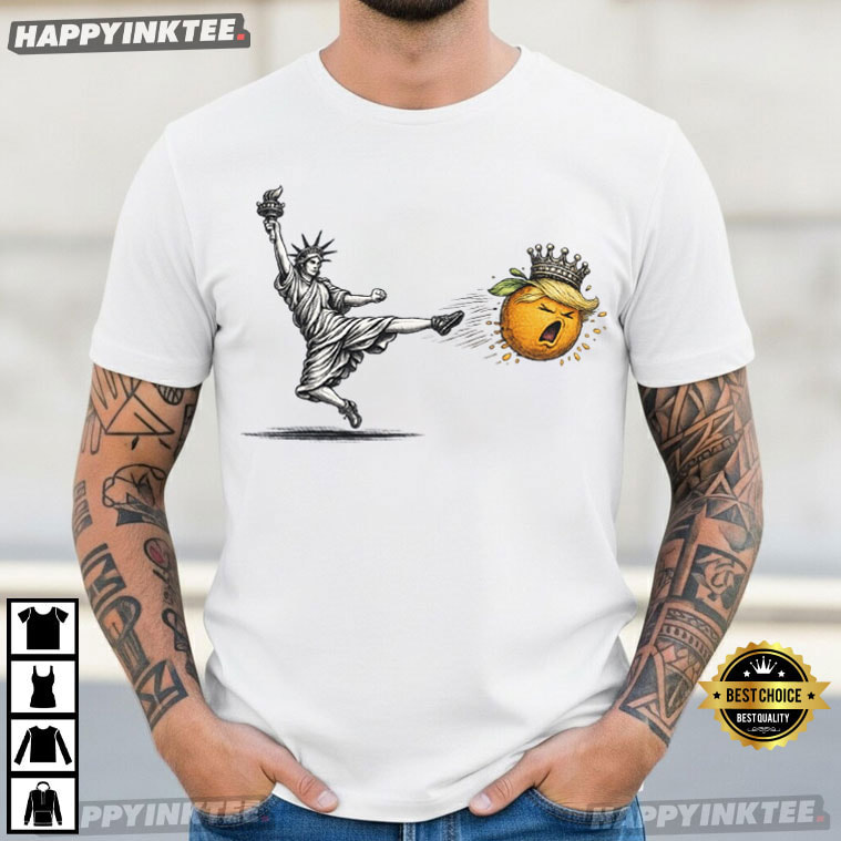 There is no whispering in this design — it speaks loud and clear. The Statue of Liberty Kick Trump Orange FDT Anti Trump T-Shirt use astute visual satire to transform a universal symbol of freedom into a powerful, thought-provoking statement piece. At the center is a dynamic illustration of the Statue of Liberty, reimagined mid-action—delivering a powerful kick toward a stylized orange character wearing a crown. The imagery is symbolic, exaggerated, and intentionally provocative.