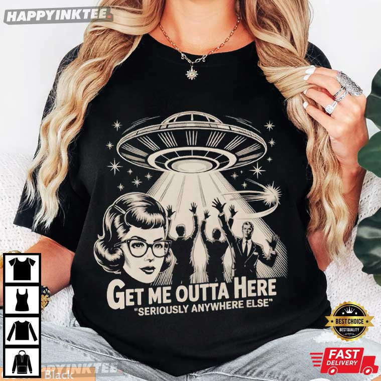 If you love sci-fi, retro art, and a good dose of sarcastic humor, this Stranger Things Get Me Outta Here Alien UFO Funny Movie T-Shirt is the perfect match. The design features a vintage-style UFO beaming up a crowd, with a classic 1950s comic-inspired character saying exactly what we all feel sometimes—“Get me outta here. Seriously anywhere else.” This Stranger Thing tee is great for everyday wear, binge-watch nights, conventions, or simply expressing your mood in the funniest way possible.