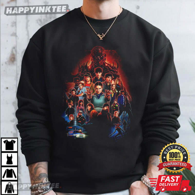 The Horror Sci-Fi Movie Based on Stranger Things T-Shirt is a love letter to late-night marathons, neon-lit memories, and the kind of terror that gets under your skin and remains there. This design is bold, movie-like, and easy to spot. It looks like a classic movie poster that you could wear.