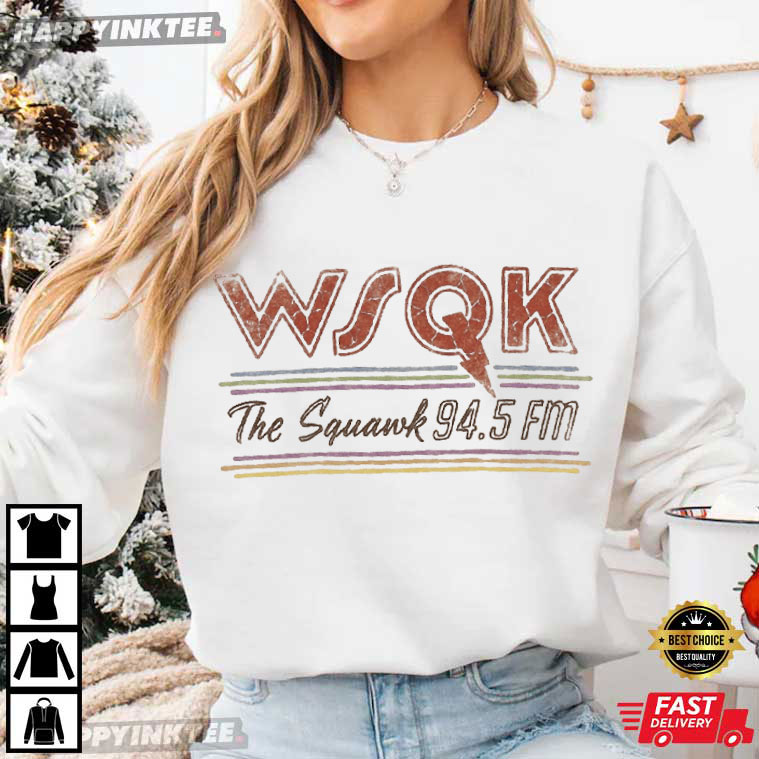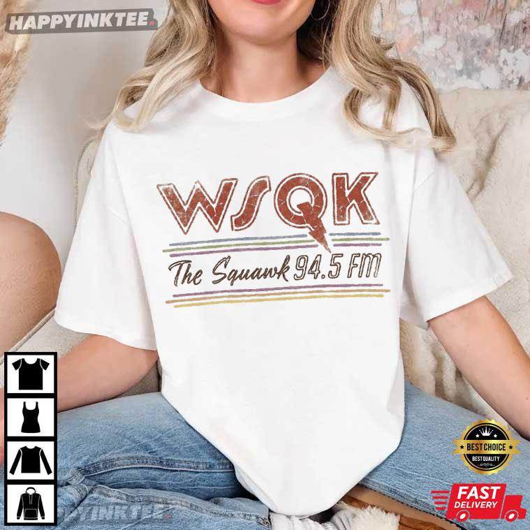 The Stranger Things WSQK The Squawk 94.5 FM Fan Merch T-Shirt is a clean, retro-style tribute to the fake radio station that helped make Stranger Things feel creepy and nostalgic. This shirt looks like a classic local radio emblem from the 1980s. It feels like something you would really find at a small-town station in Hawkins, Indiana.