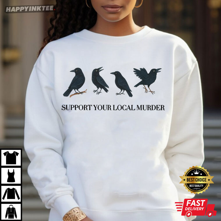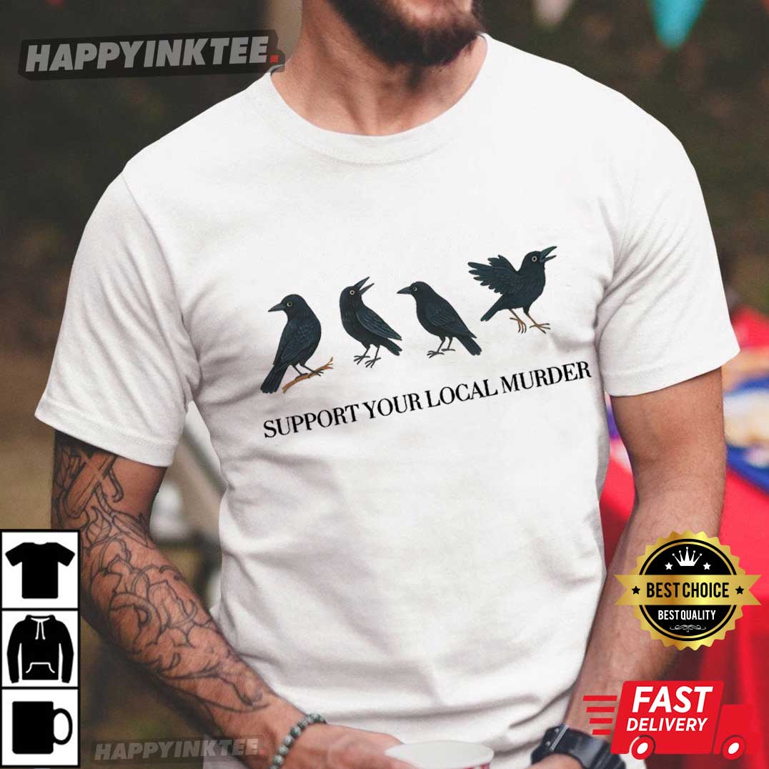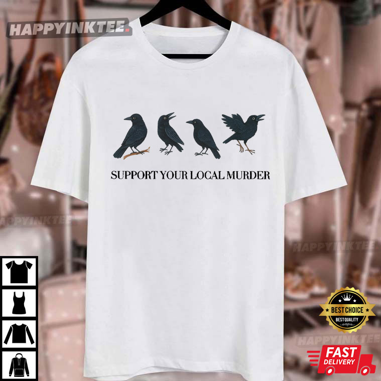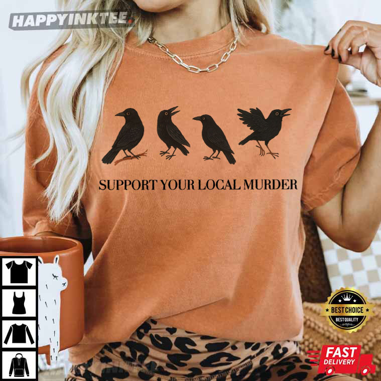 Celebrate spooky season with this witty Support Your Local Murder T-Shirt, showcasing a design of 4 crows. It is a great pick for bird lovers, gothic fashion enthusiasts, and anyone who enjoys a bit of dark humor. It mixes witchy vibes with some Halloween spirit.