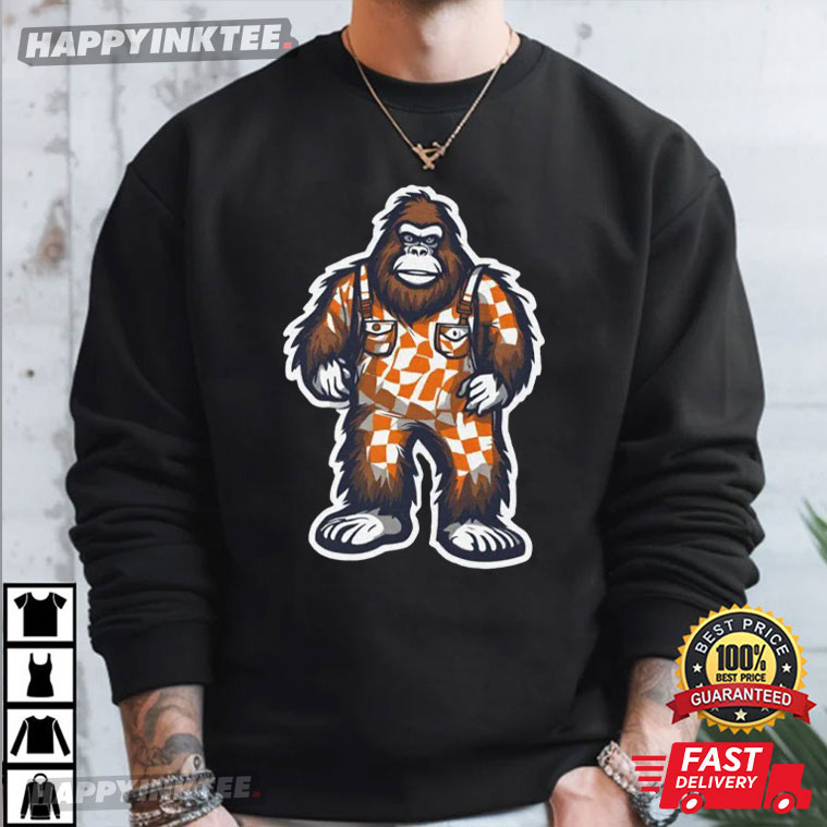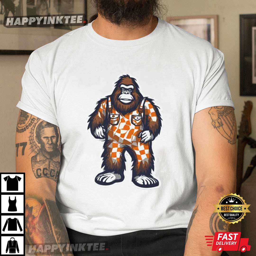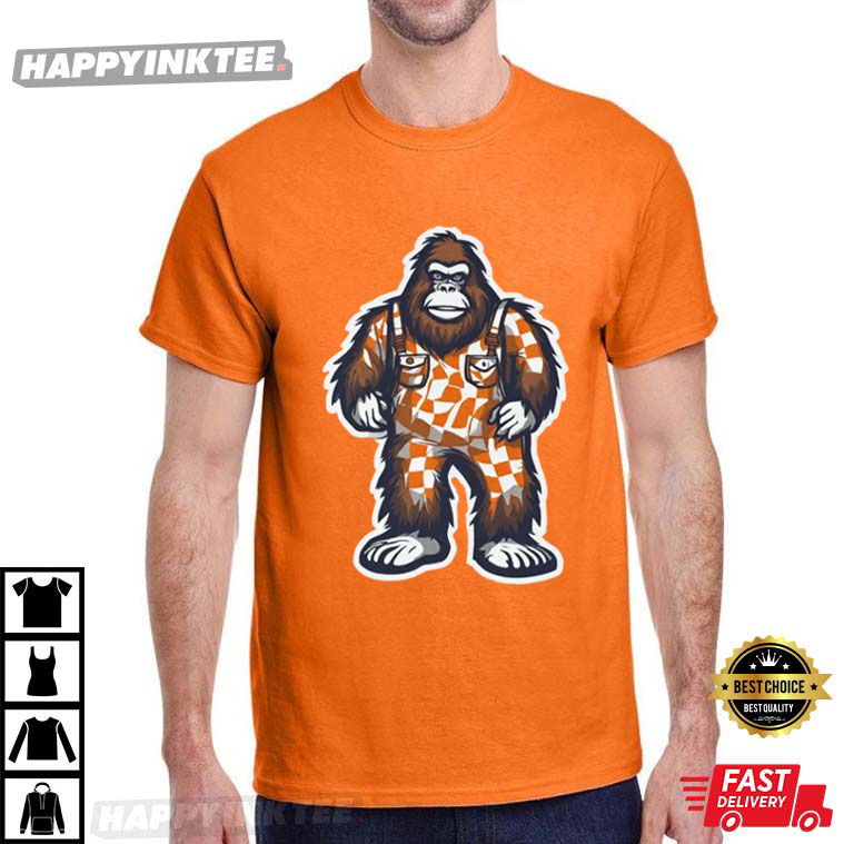 Show off your Tennessee Vols pride in a totally awesome way! This Bigfoot Vols T-Shirt shows off the legendary Sasquatch rocking the University of Tennessee’s classic orange and white checkerboard overalls, a fun reference to Neyland Stadium’s well-known end zones. It combines the intrigue of Bigfoot with the electric spirit of Tennessee football.