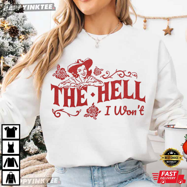 The Hell I Won’t Retro Cowgirl Graphic Western T-Shirt is all about having confidence, being tough, and having that unapologetic Western spirit. This design combines an old-fashioned cowgirl drawing with flowers and classic Western lettering. It has a modern, brave message: don’t doubt me.
