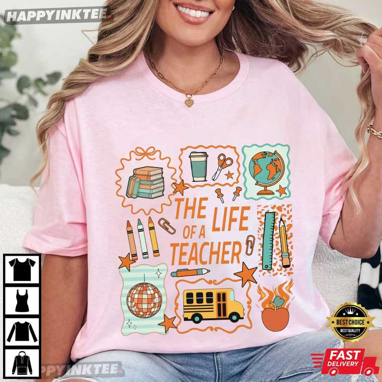 This The Life Of A Teacher Showgirl Back To School Teaching T-Shirt depicts the routine moments that contribute to the gratifying and chaotic nature of teaching. The playful, illustrated layout feels like a scrapbook of a teacher’s daily routine morning coffee, school bus arrivals, stacks of papers, creativity, and constant multitasking. It’s an enjoyable and relatable way to display your teaching spirit and is ideal for casual Fridays, teacher appreciation events, back-to-school season, classroom photographs, and everyday wear.