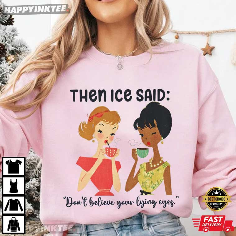 Soft colors, vintage charm, and razor-sharp satire come together in the Then Ice Said Don’t Believe Your Lying Eyes Abolish Ice T-Shirt. This design uses a nostalgic, mid-century illustration style to deliver a message that’s anything but outdated. This Abolish Ice shirt critiques institutional gaslighting and the way authority often asks the public to ignore lived reality. The phrase “don’t believe your lying eyes” is a long-standing expression used to mock attempts at denying obvious truth — Here, it is directed at US Immigration and Customs Enforcement, emphasizing criticism of false information, a lack of responsibility, and the denial of demonstrated harm to immigrant communities.