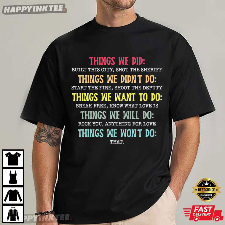 This shirt is for music fans who want humor, nostalgia, and a little bit of rebellion. It has famous lyric references and bold, color-stacked text that stands out against a classic black background.