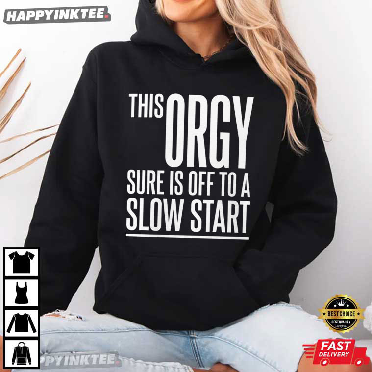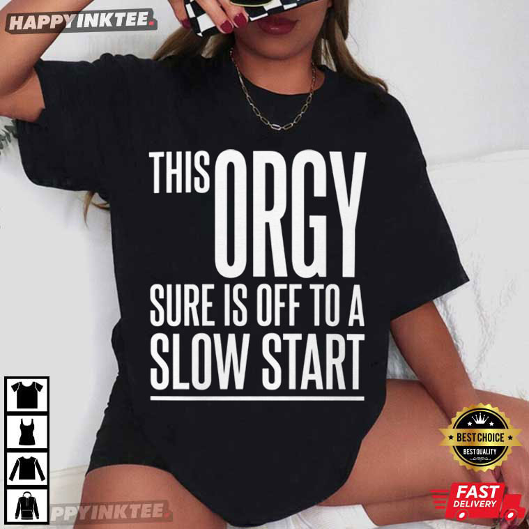 This Orgy Sure Is Off To A Slow Start Funny Party T-Shirt is a striking novelty graphic t-shirt made for fans of lighthearted sarcasm and edgy comedy — With its clean typography and humorous punchline, this shirt instantly grabs attention and often becomes the center of laughter at parties or social gatherings. The design offers a traditional form of adult humor that relies on unexpected punchlines and exaggerated scenarios. It is straightforward, simple, and purposefully provocative.