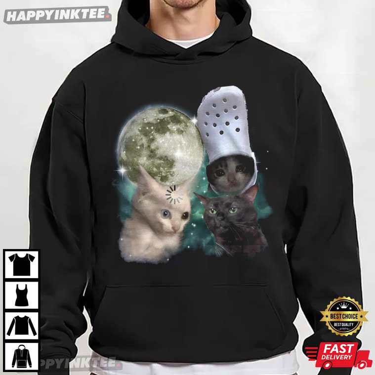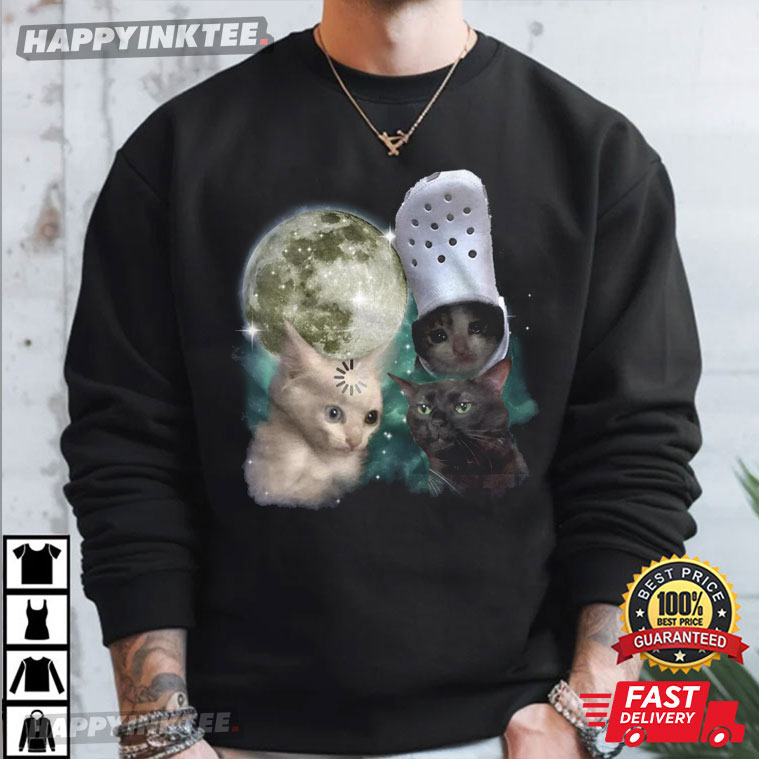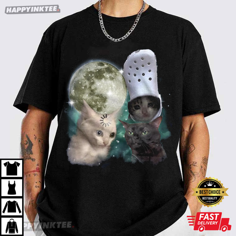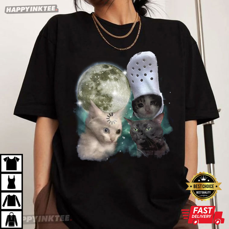 The Three Cats Retro Moon Graphic Meme T-Shirt is for people who spend a lot of time online, love cats, and like comedy that is a touch crazy—in the nicest way. This shirt has a beautiful, retro space look with a strange internet meme vibe. It feels like something you would have seen while scrolling through your favorite late-night feed.