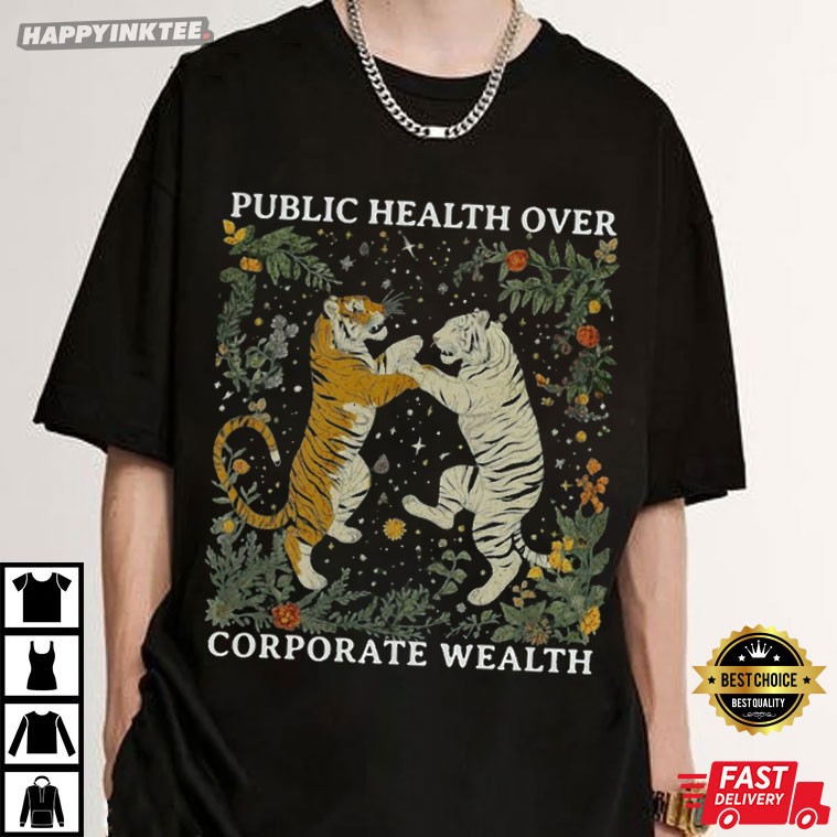 Wear the Tiger Boho Public Health Over Corporate Wealth T-Shirt and cheer for change with the *Tiger interviewers! “Public Health Over Corporate Wealth” is a battle cry against prioritizing profits over people. Those who prioritize communal well-being, equitable pay, and universal healthcare over corporate boardroom ambitions will find resonance in this allusion to anti-oligarchy and anti-fascism campaigns. The tiger, a symbol of strength and rebellion, adds a boho-chic twist, making this activism apparel as stylish as it is impactful. Wear an Anti-Fascism T-shirt, love it, and let the world know: health justice trumps corporate greed.