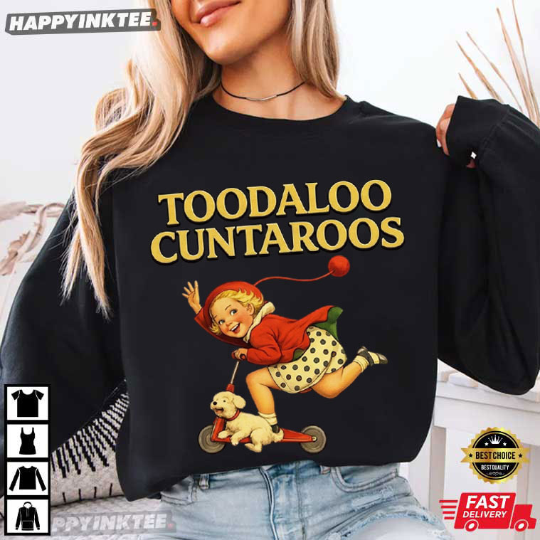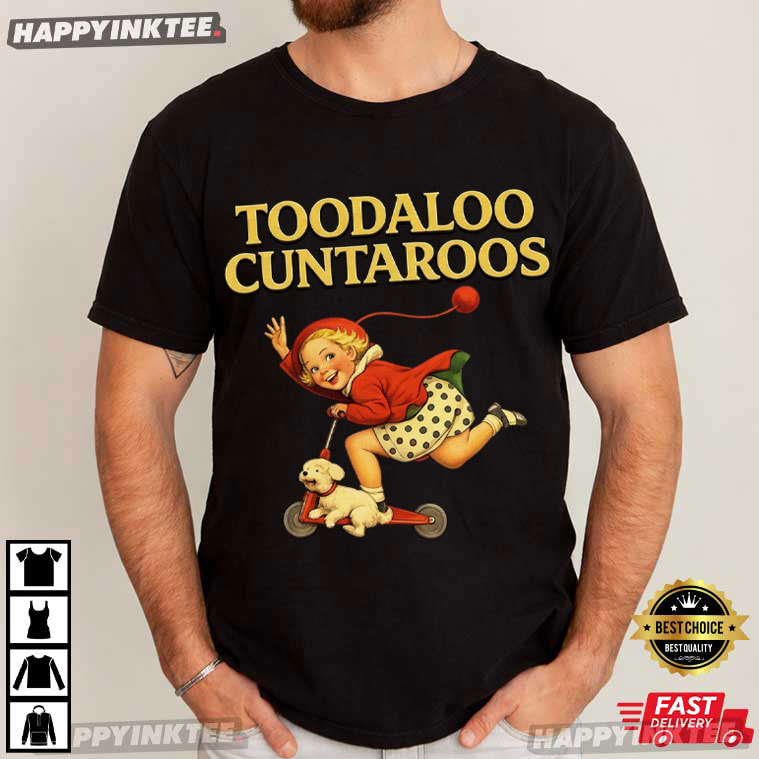The Toodaloo Cuntaroos Funny Retro Kid Scooter Dog Animal T-Shirt is a quirky and eye-catching design that blends vintage illustration style with bold humor. Featuring a cheerful retro-style child riding a scooter with a small dog companion and the playful phrase “Toodaloo Cuntaroos,” Wrapped in antique artwork, this retro meme humor shirt conveys a hilarious, slightly irreverent message.