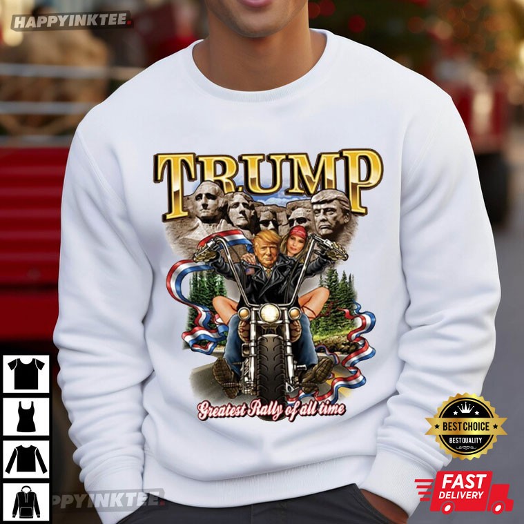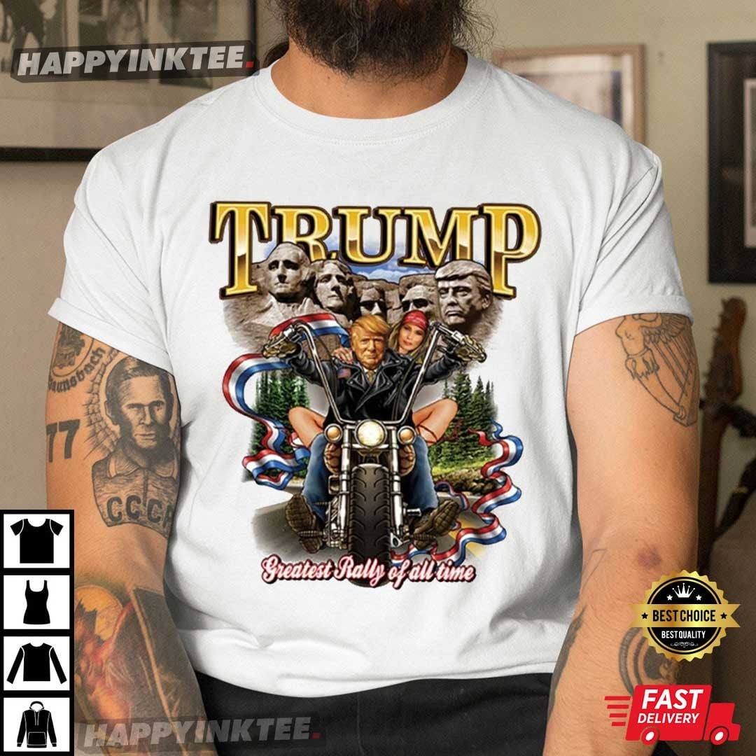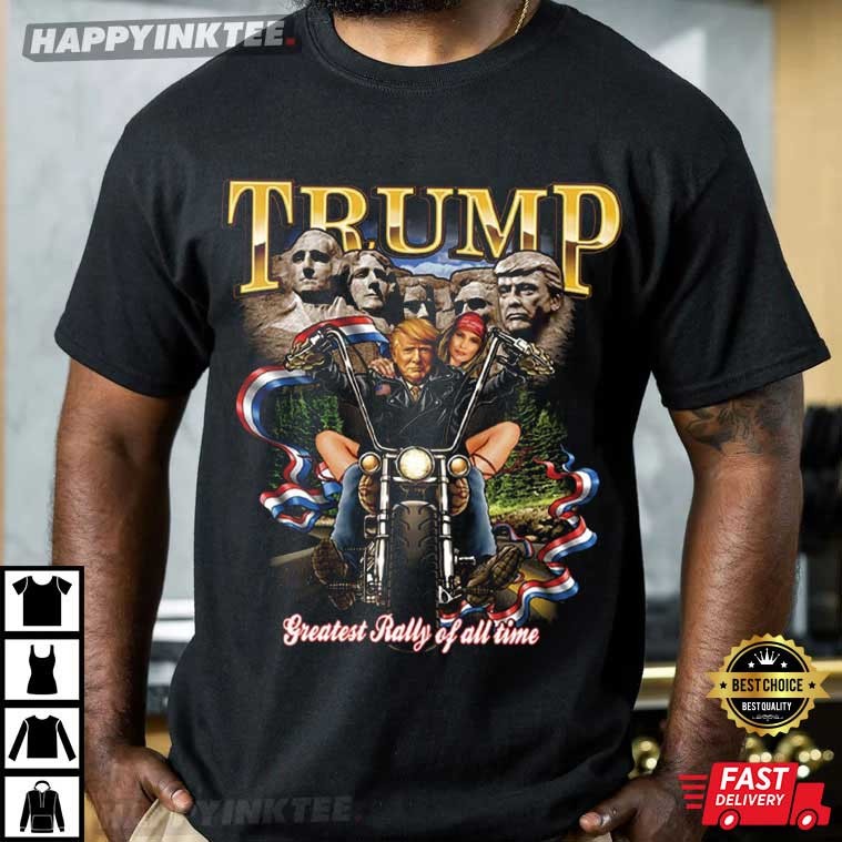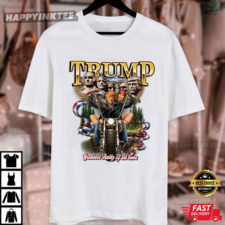 The Trump MAGA T-shirt features a detailed graphic design with the word “TRUMP” in large, gold letters at the top, an illustration of Donald Trump riding a motorcycle with a woman behind him, and a background that includes a depiction of Mount Rushmore with Trump’s face added alongside the four U.S. presidents (Washington, Jefferson, Roosevelt, and Lincoln). “Greatest Rally Of All Time” emphasizes the rally’s importance or greatness, suggesting that it stands out from other political rallies for its enthusiasm, historical significance, or impact on Trump’s movement. It capitalizes on the notion of a legendary or iconic event and celebrates the strength and zeal of Trump’s supporters.