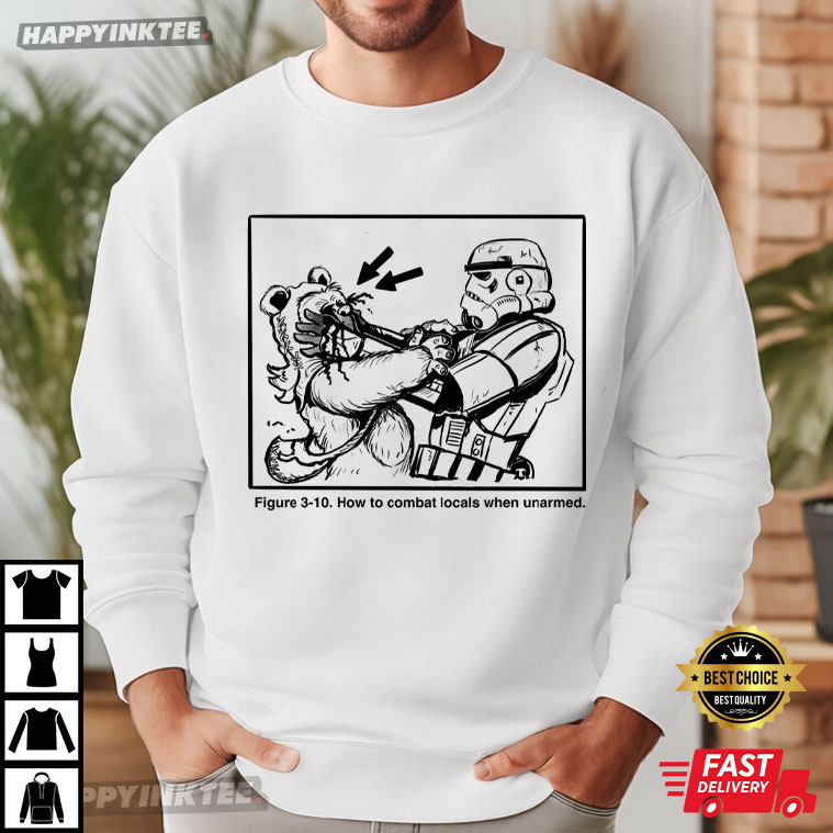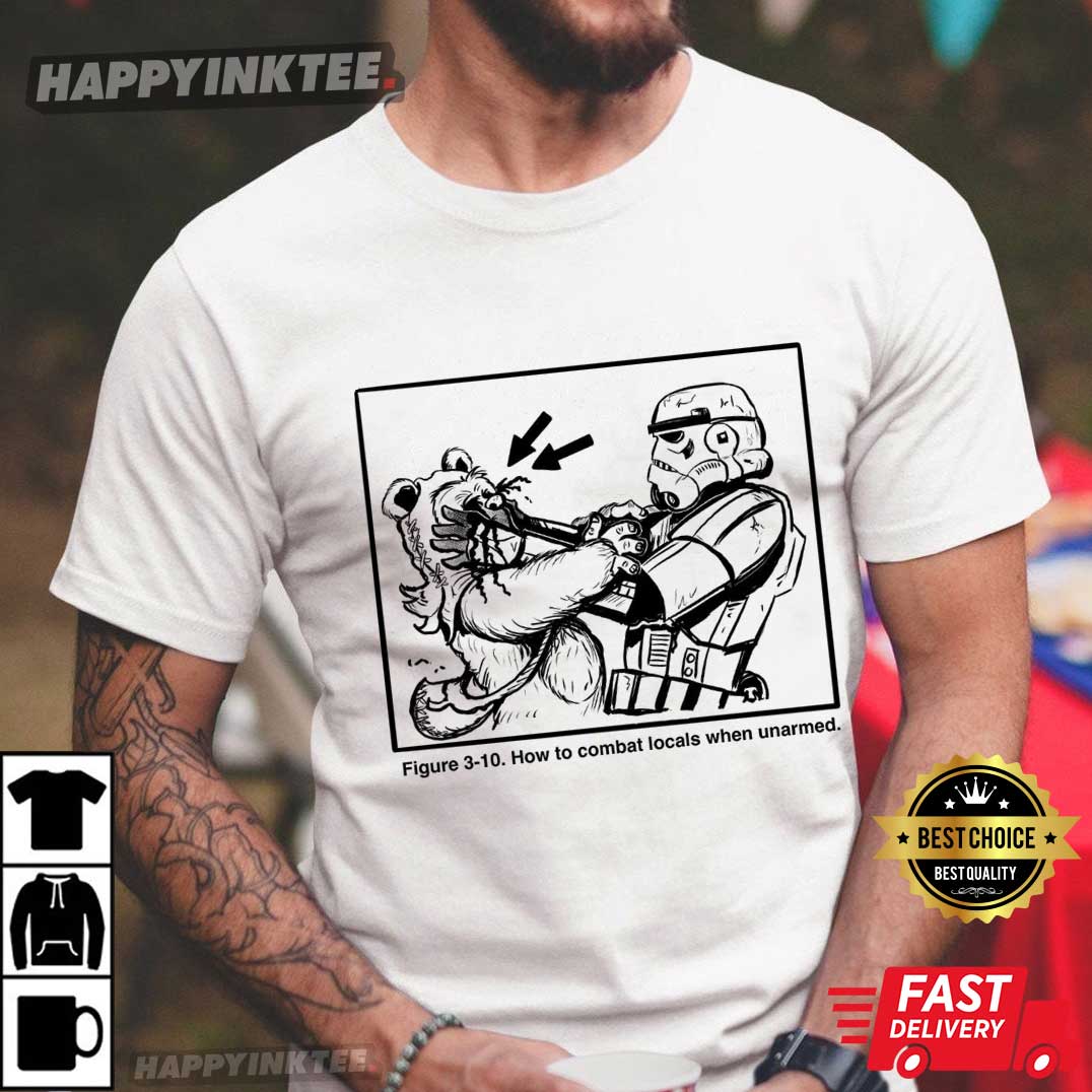 Add some out-of-this-world fun to your closet with the Unarmed Trooper Attack Funny Star Wars T-Shirt. This funny parody design features a stormtrooper in a training manual-style sketch, humorously showing “Figure 3-10: How to combat locals when unarmed”—by poking an Ewok right in the eyes.