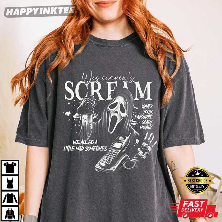 The design shows Ghostface in a cool vintage style, holding that iconic phone with some spooky text like “We all go a little mad sometimes” and “What’s your favourite scary movie?” Distressed detailing gives this Scary movie Ghostface shirt a cool retro vibe, making it perfect for Halloween or just for fans of horror any time of the year.