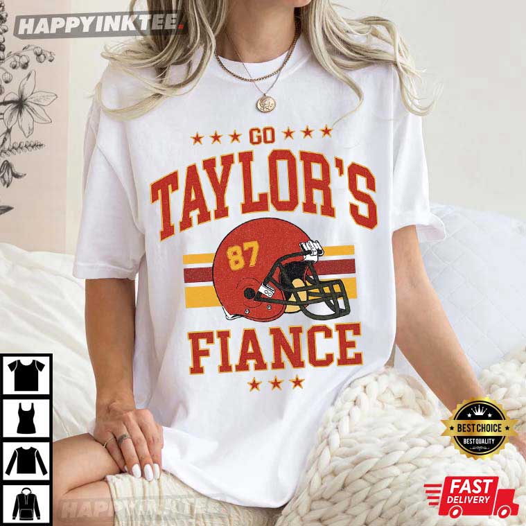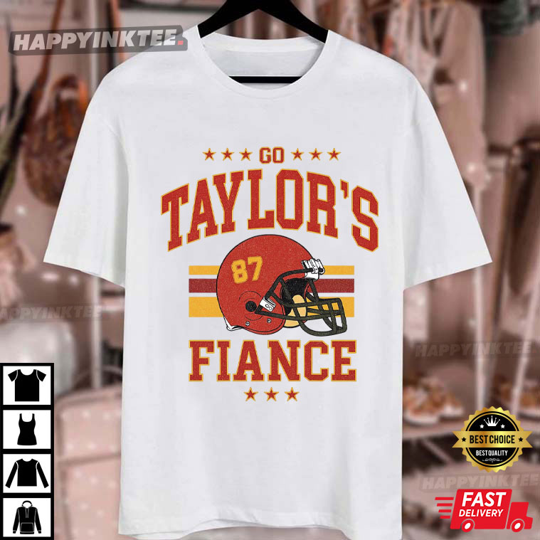With our Vintage Go Taylors Fiance T-Shirt, you can show your support for the most talked-about couple in sports and pop culture. It combines the energy of a Kansas City game day with the love of Taylor Swift. It has big, retro letters, a classic football helmet, and the number 87.