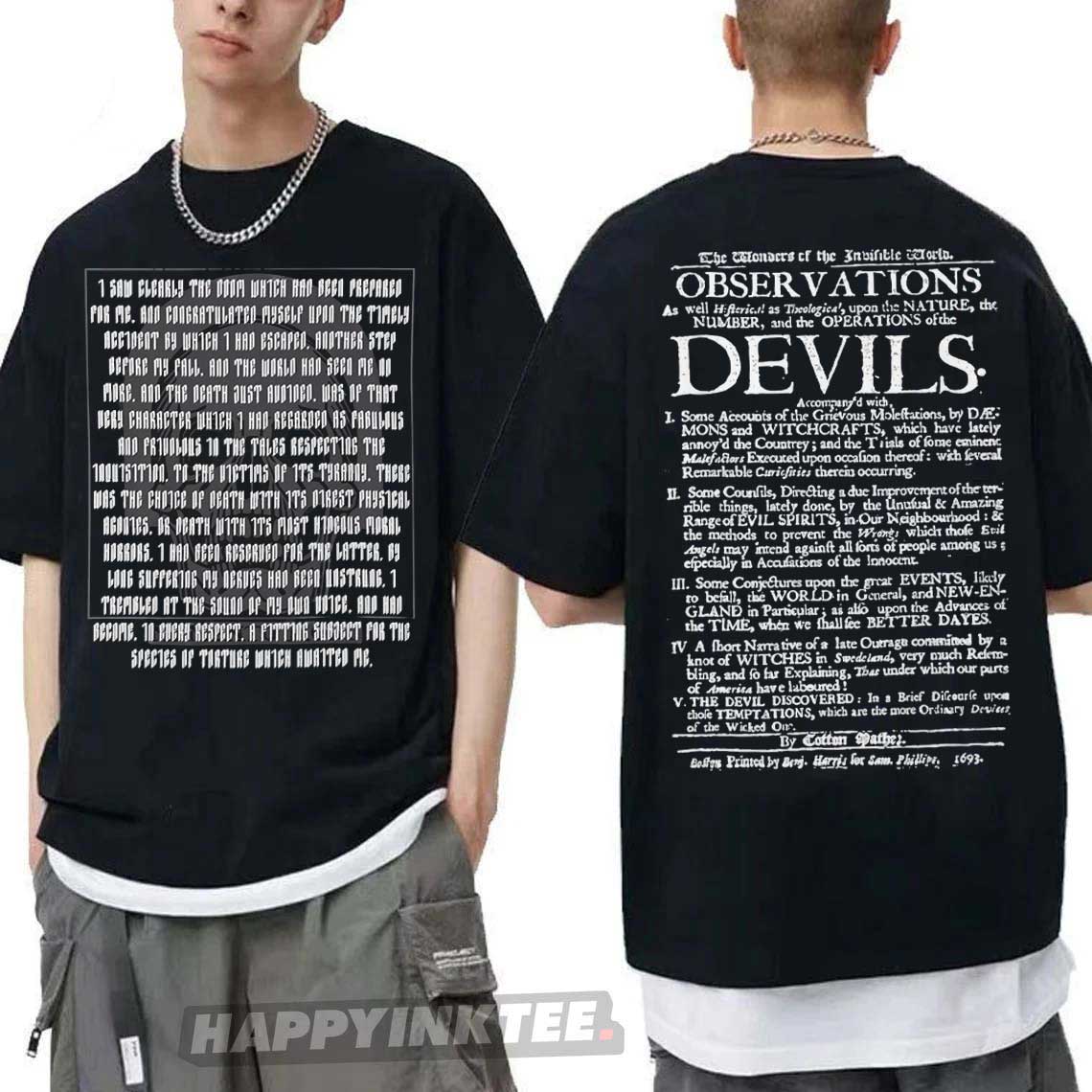 The front features some eerie lines from Poe’s spooky short story The Pit and the Pendulum, a gripping tale about fear, time, and survival. The back features a reproduction of Cotton Mather’s “Observations on the Invisible World, and the Operations of Devils” from 1693, nodding to the witch trials and that Puritan-era fear of the supernatural.