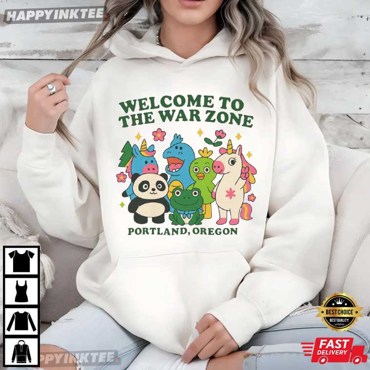You know that Portland has its own sense of humor if you’ve ever been there. This shirt is a great fit for that. The Welcome to the War Zone Portland Oregon tee has a fun group of cute, cartoon-style animals on it, like a wide-eyed panda, a happy frog, a pastel unicorn, a blue dinosaur, a chirpy bird, and more. The amusing thing about this design is how the soft, cute imagery and the strong statement “Welcome to the War Zone” are so different from each other. It’s a playful nod to the city’s well-known strange, unexpected, and occasionally chaotic vibe.