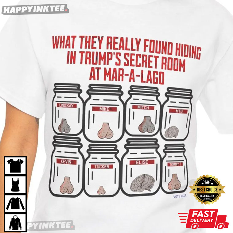 “What They Really Found Hiding in Trump’s Secret Room at Mar-a-Lago” references the FBI’s raid on Trump’s Mar-a-Lago estate, where classified documents were allegedly found. The joke distorts the story by implying that they discovered jars containing the symbolic “manhood” and “brains” of particular political personalities in place of documentation. It is evident from the “Vote Blue” phrase at the bottom that this shirt is intended for liberal or Democratic audiences that disagree with the politicians mentioned in the design.