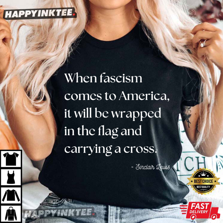 Check out this T-shirt featuring a quote from Sinclair Lewis that really hits home about history and its importance, “When Fascism Comes To America.” It showcases the impactful quote often linked to Sinclair Lewis: “When fascism comes to America, it will be wrapped in the flag and carrying a cross.” It’s a cool way to make a statement about politics.