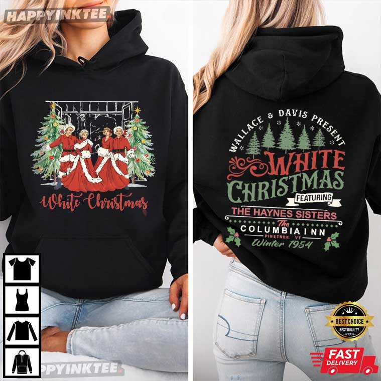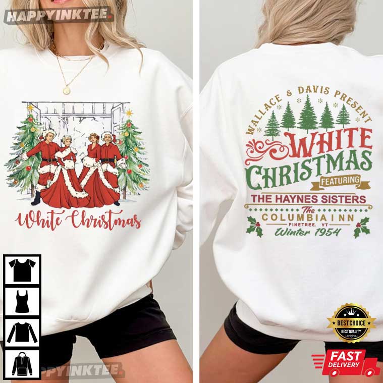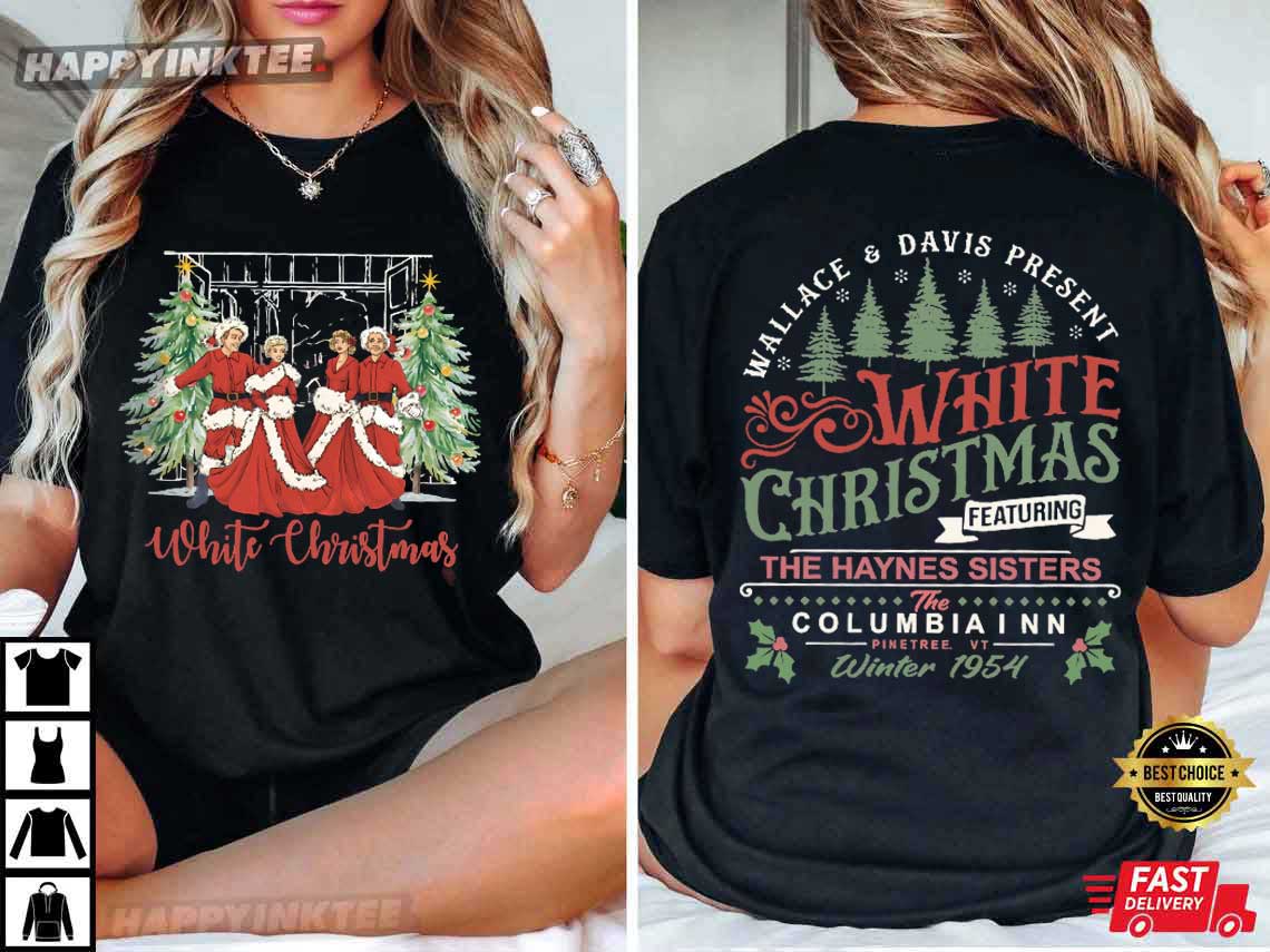 This White Christmas Columbia Inn Pine Tree Vermont T-Shirt brings all the homey charm of the 1954 movie straight into your closet if you adore classic holiday movies and old-fashioned Christmas memories. The front of the design shows the famous Haynes Sisters in their red holiday dresses, with Christmas trees and stage-style backdrop art around them. The print on the back is a copy of an old poster for the Columbia Inn in Pine Tree, Vermont, a place that every fan of White Christmas knows right away.
