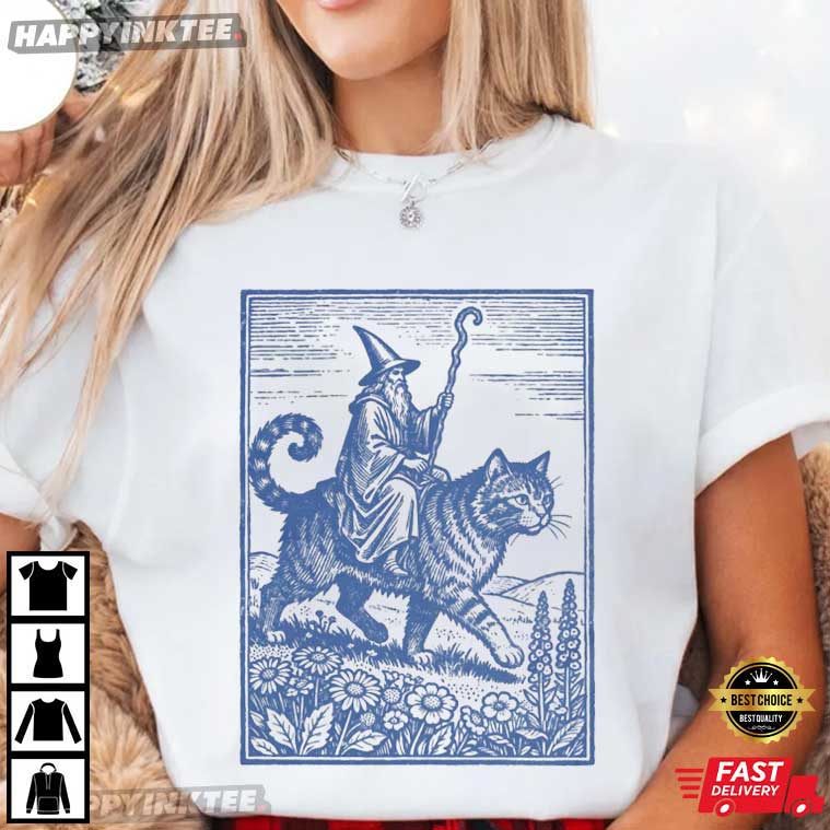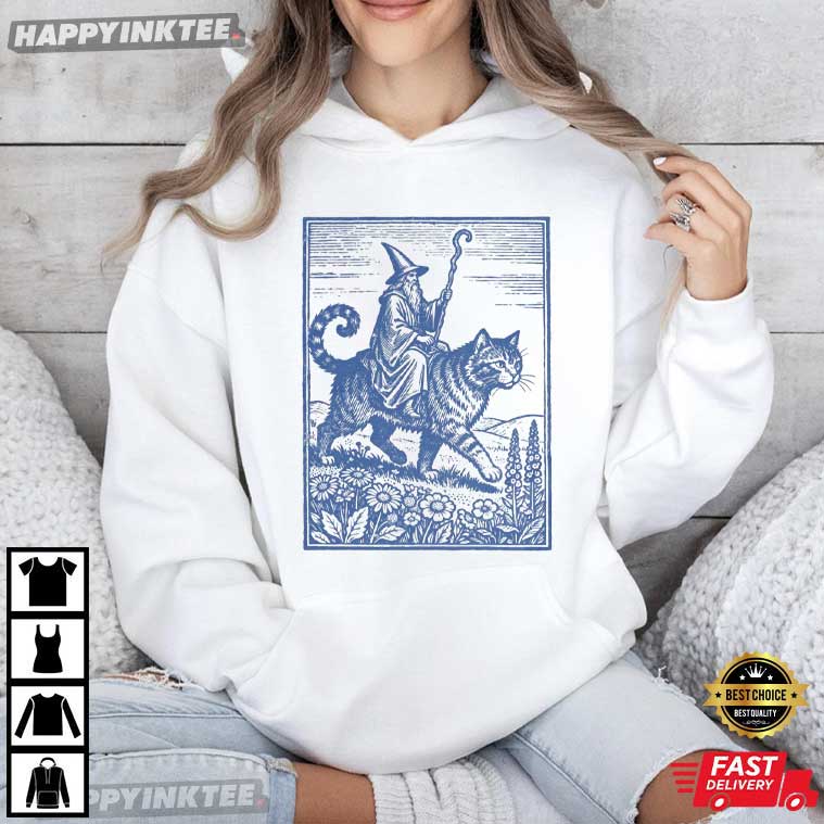 The Wizard Cat Rider Vintage Retro Fantasy Medieval Sorcerer T-Shirt is a great mix of old-world art, mythology, and fantasy. This design is based on woodcut drawings from the Middle Ages. It shows a wizard in a robe quietly riding a big cat through a peaceful countryside, staff in hand and spell already cast. It has a fun, secretive, and nerdy side that makes it the finest kind of nerdy.