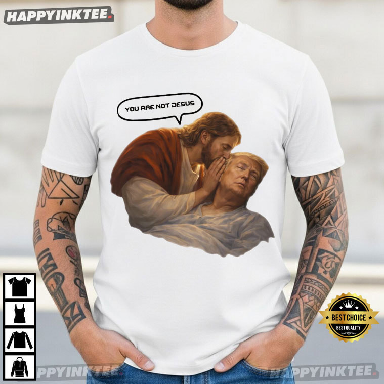 Make a statement without saying a word with our You Are Not Jesus Funny Anti Trump Meme T-Shirt — This viral-style meme shirt features a humorous illustration of Jesus leaning in and whispering to Donald Trump: “You Are Not Jesus”—a vicious, hilarious insult that’s ideal for anyone looking to make fun of the former president in style.
