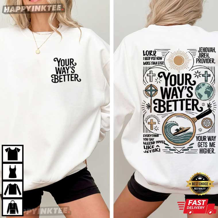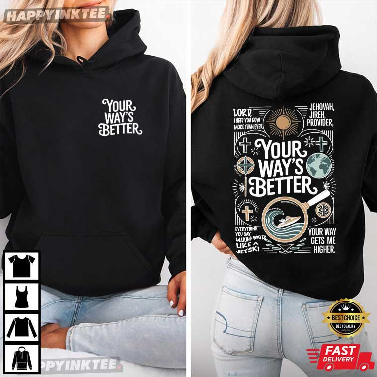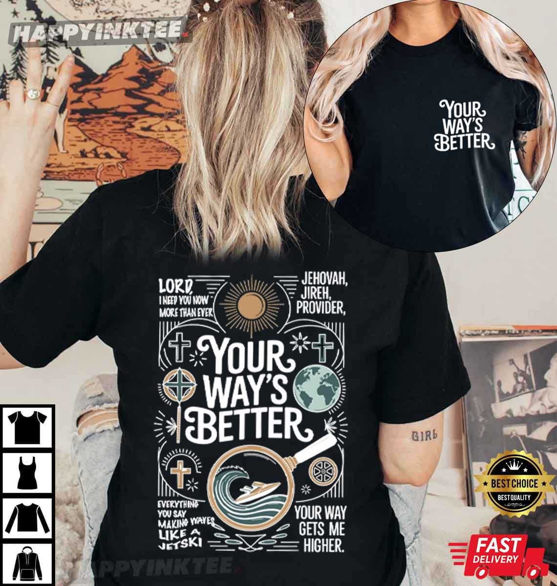 Your Way’s Better Christian Religious Proverbs 169 Bible Verse T-Shirt with “Your Way’s Better” faith message and symbolic design. A meaningful Bible verse shirt for believers. This design serves as a reminder that peace comes from surrender, drawing inspiration from the Book of Proverbs 16:9, which states, “In their hearts, humans plan their course, but the Lord establishes their steps.” References such as “Jehovah Jireh, Provider” reinforce faith in provision, The flowing, upbeat typography, on the other hand, symbolizes trust, progress, and movement beyond our own goals.