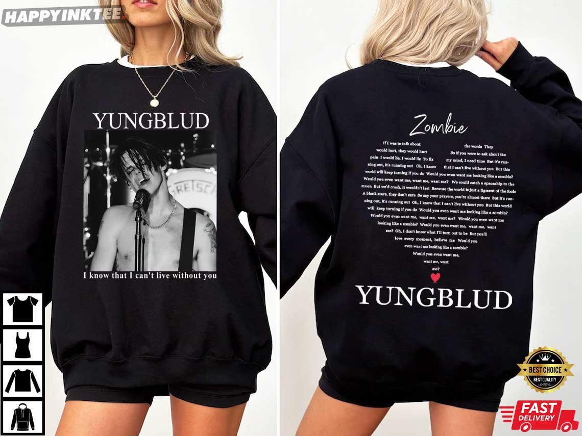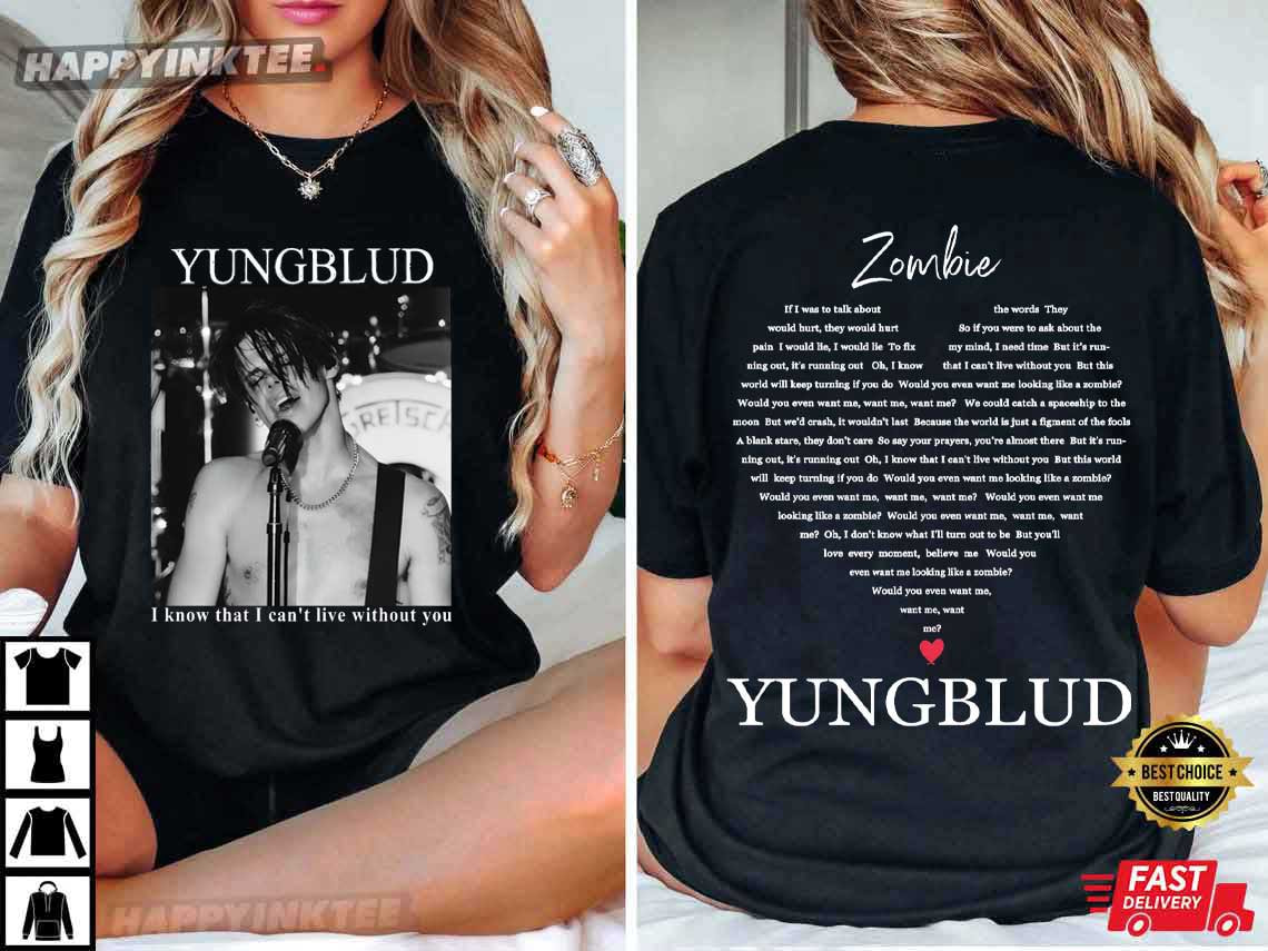 Bold, emotional, and beautifully raw—this Yungblud Zombie Song Lyrics Music Lovers T-Shirt captures the heart of one of his most powerful tracks. The front design features a striking black-and-white portrait of Yungblud mid-performance, drenched in stage lights and grit, along with the line “I know that I can’t live without you.” The entire “Zombie” lyrics are presented in a neat, creative arrangement on the reverse, giving the shirt the appearance of both a piece of merchandise and a narrative. Fans identify this moment right away: it’s intense, vulnerable, and brimming with the energy that makes his music so powerful.